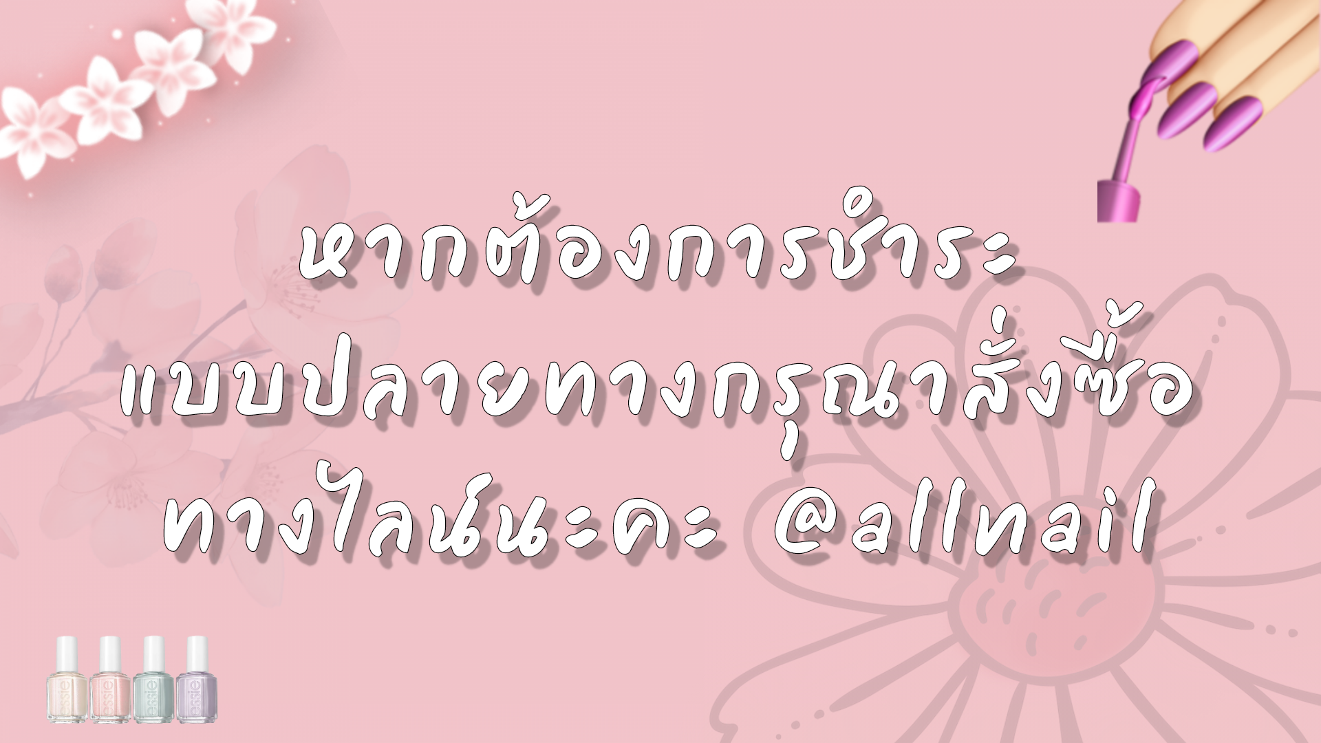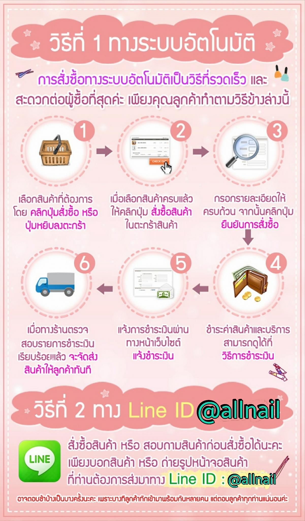 - ชำระเงินเรียบร้อยแล้วกรุณาแจ้งชำระเงินด้วยนะคะ ถ้าลูกค้าไม่แจ้งเราจะไม่สามารถส่งสินค้าให้ได้ค่ะ สามารถแจ้งชำระเงินได้2ช่องทาง 1.แจ้งชำระเงินหน้าเว็บ 2.ทางไลน์ร้าน @allnail